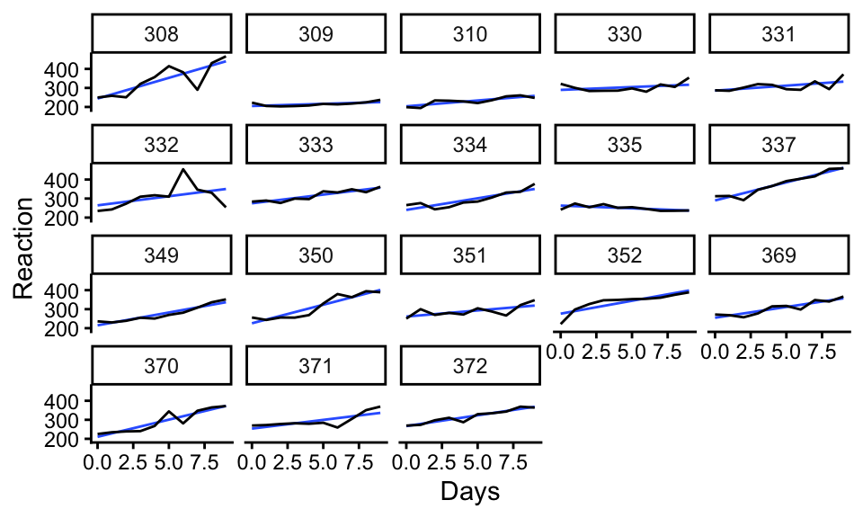 m_ri <- lmer(Reaction ~ Days + (1 | Subject), data = sleepstudy,